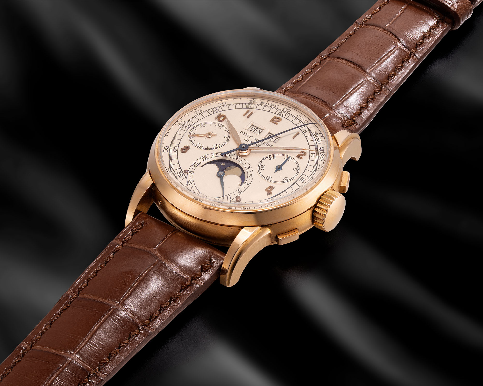 PATEK PHILIPPE Ref. 2499 “The Pink First Series”, An historically important, pink gold perpetual calendar chronograph wristwatch with French calendar and case made by Vichet, the only known pink gold first series example with British hallmarks, HK$24,000,000-48,000,000