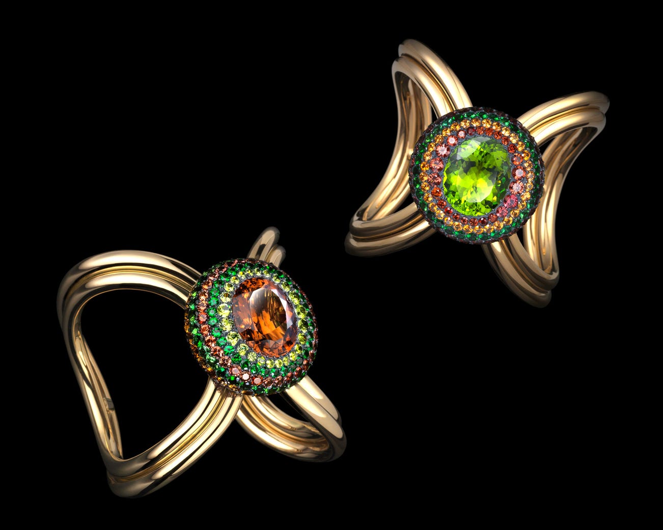 XO CUFFS peridot, tourmalines, spinels, garnets, silver and gold © Lauren Adriana, photographed by Richard Valencia