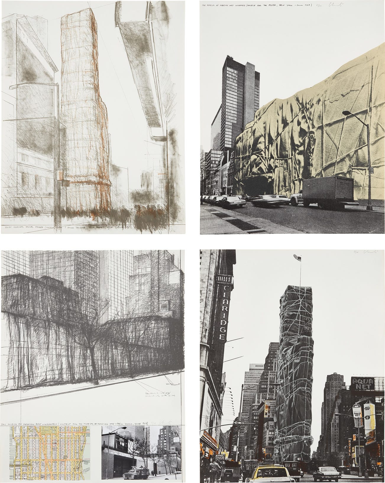 Including: Allied Chemical Tower, Packed, Project for 1 Times Square, New York (side), Allied Chemical Tower, Packed, Project for 1 Times Square, New York (front), The Museum of Modern Art Wrapped (Project for The MOMA, New York-June 1968), and The Museum of Modern Art Wrapped (Project for The Museum of Modern Art, New York, June-1968)