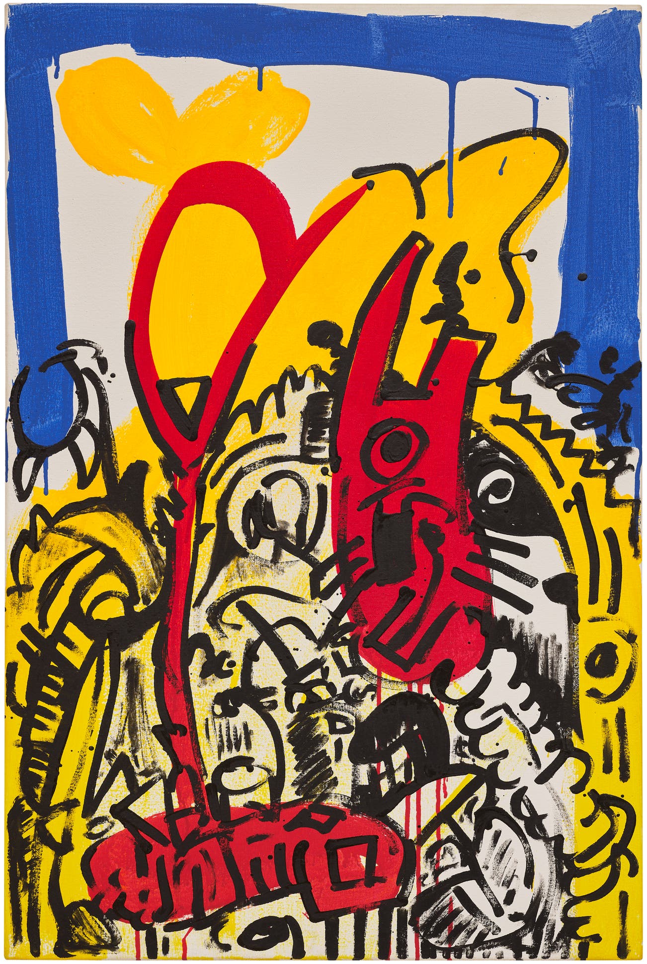 signed, titled and dated "RED-YELLOW-BLUE #21 JAN 12 87 ©K. Haring ⨁" on the overlap