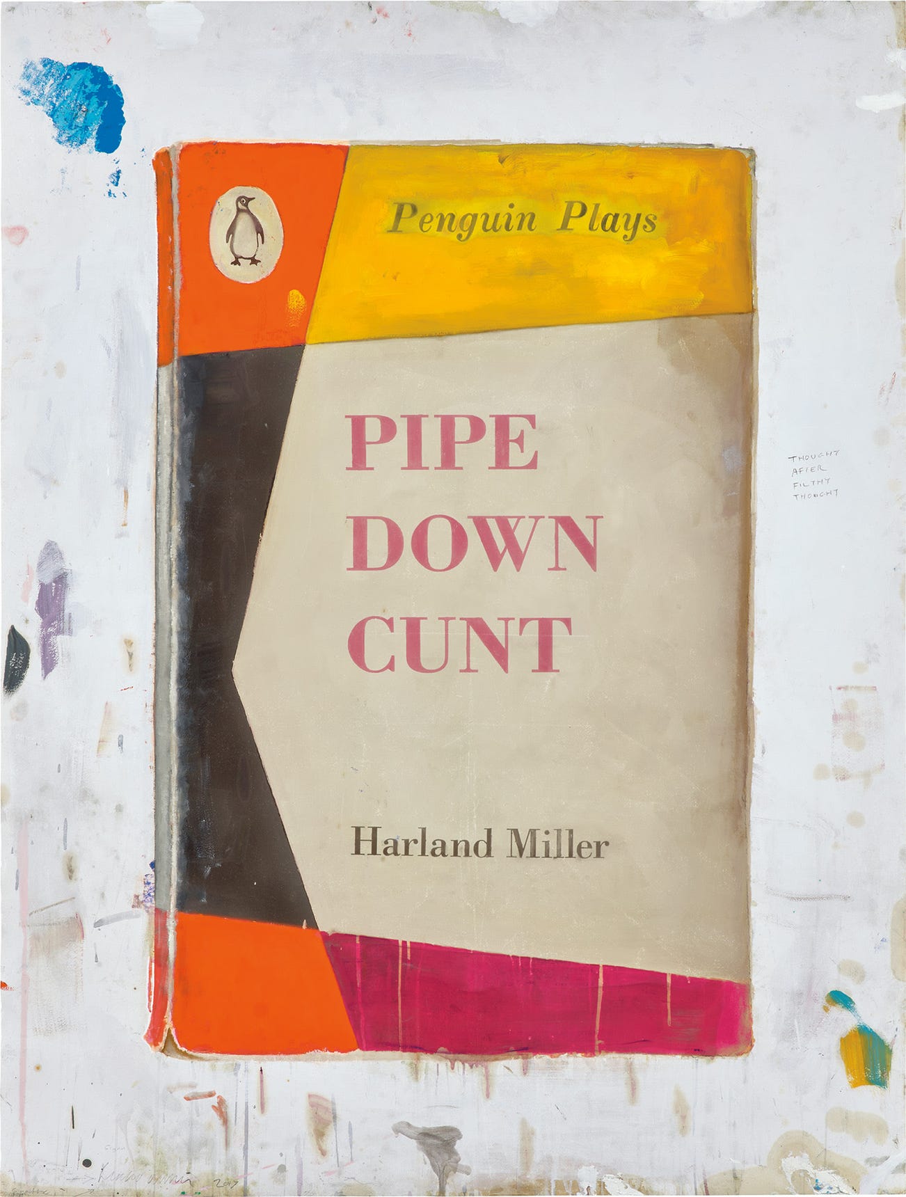 signed, inscribed and dated "signature sign Harland Miller 2017" lower left; further inscribed "THOUGHT AFTER FILTHY THOUGHT" center right