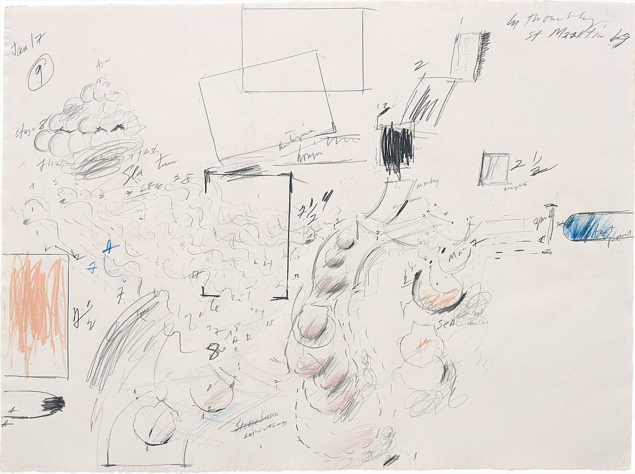 Perhaps, Twombly’s greatest influence was a stint as a cryptologist in the US army which shaped the artists fascination with the enigmatic and enhanced his methodical and repetitive approach to his work. The artist’s use of codified language, coupled with gestural mark-marking, denoting his quest for ‘expressive immediacy’, has formed a body of work which is truly unique in the canon of art history. The present lot is no exception; the plan-view composition with intersecting geometric shapes, akin to architectural drawings, infused with expressive marks draws a paradox between the regimented line and the artist’s impulsive response to his surroundings. The frenetic and free quality in Twombly’s works is often linked his New York School origins and his affiliation with abstract expressionism. Similar to the aforementioned, Untitled, 1969 is visceral and rich with the physical presence of the artist – collaged together with his curiosity surrounding poetry, history and architecture.