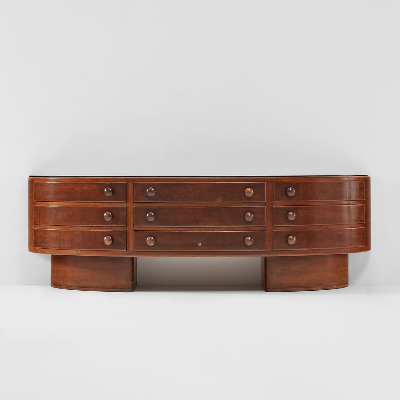 Walnut, walnut-veneered wood, glass.