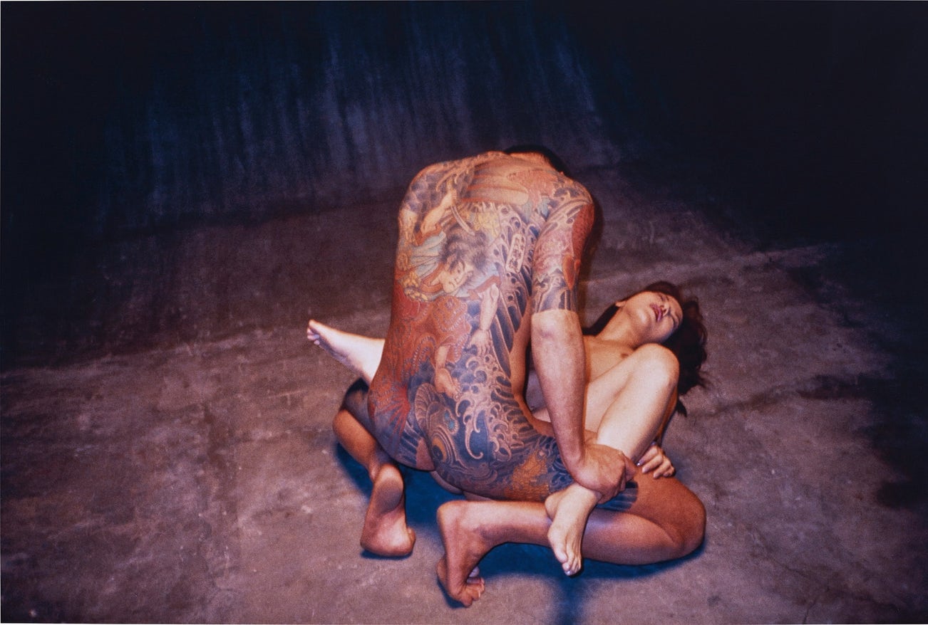 In the following two lots, Tokyo Comedy, 1997, by Nobuyoshi Araki is presented in colour and black and white. Printed from different negatives, these two versions demonstrate Araki’s distinct eroticism. In the chromogenic print, the intensity of the yakuza’s tattoos is accentuated, bringing the moment into a contemporary setting. In the gelatin silver print, the positioning of the figures closer in the foreground, together with the contrast of light and shadows, add to the drama of the scene. These two versions of the same subject provide a glimpse into Araki’s artistic experimentation.