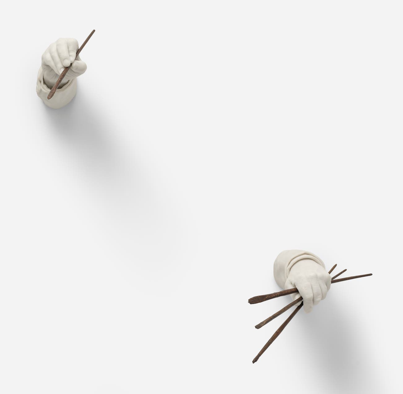 Two hand-carved marble sculptures with four bronze paint brushes.