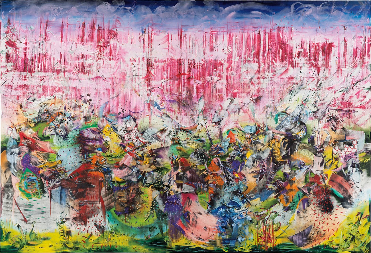 Ali Banisadr is an Iranian-American contemporary artist working in New York. Taking influence from the annals of art history as well as from memories of his childhood during the Iran-Iraq War, Banisadr creates harrowing whirlwinds of chaos and color on the surface of his canvases. He frequently describes his work in terms of tone, volume, and temperature; each canvas begins as Banisadr, who has synesthesia, reflects on the sounds and vibrations of his wartime childhood and develops the chaos until he has calmed the composition to a state of intelligibility.
