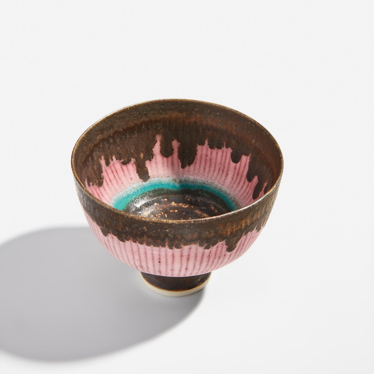 Dame Lucie Rie studied under Michael Powolny at the Kunstgewerbeschule in Vienna before immigrating to London in 1938. In London she started out making buttons for the fashion industry before producing austere, sparsely decorated tableware that caught the attention of modernist interior decorators. Eventually she hit her stride with the pitch-perfect footed bowls and flared vases for which she is best-known today. She worked in porcelain and stoneware, applying glaze directly to the unfired body and firing only once. She limited decoration to incised lines, subtle spirals and golden manganese lips, allowing the beauty of her thin-walled vessels to shine through. In contrast with the rustic pots of English ceramicist Bernard Leach, who is considered an heir to the Arts and Crafts movement, collectors and scholars revere Rie for creating pottery that was in dialogue with the design and architecture of European Modernism.