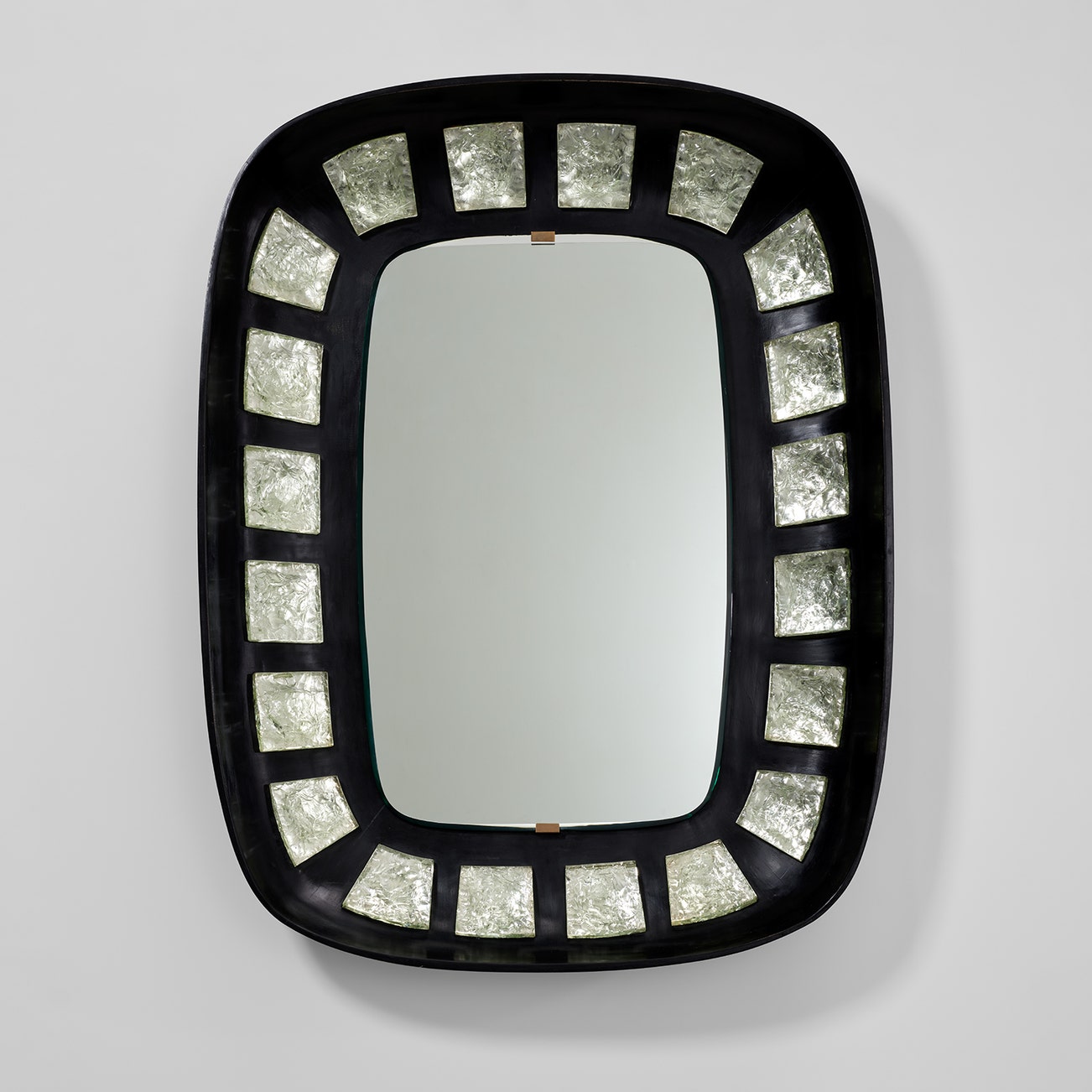 Mirrored glass, chiselled glass, ebonised wood, brass.