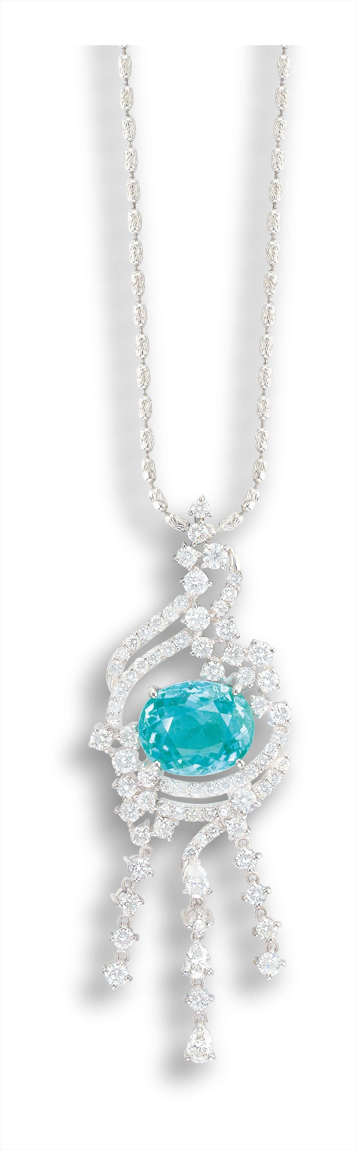 One oval Paraìba, 6.37 caratsDiamonds in the surround, totalling approximately 3.10 caratsPlatinum<em>With a platinum link-chain, adjustable, maximum length approximately 440mm </em>(6.37-carat Paraìba) <em>GIA report, numbered 6212792264, dated 17 February 2016, Brazil. </em>