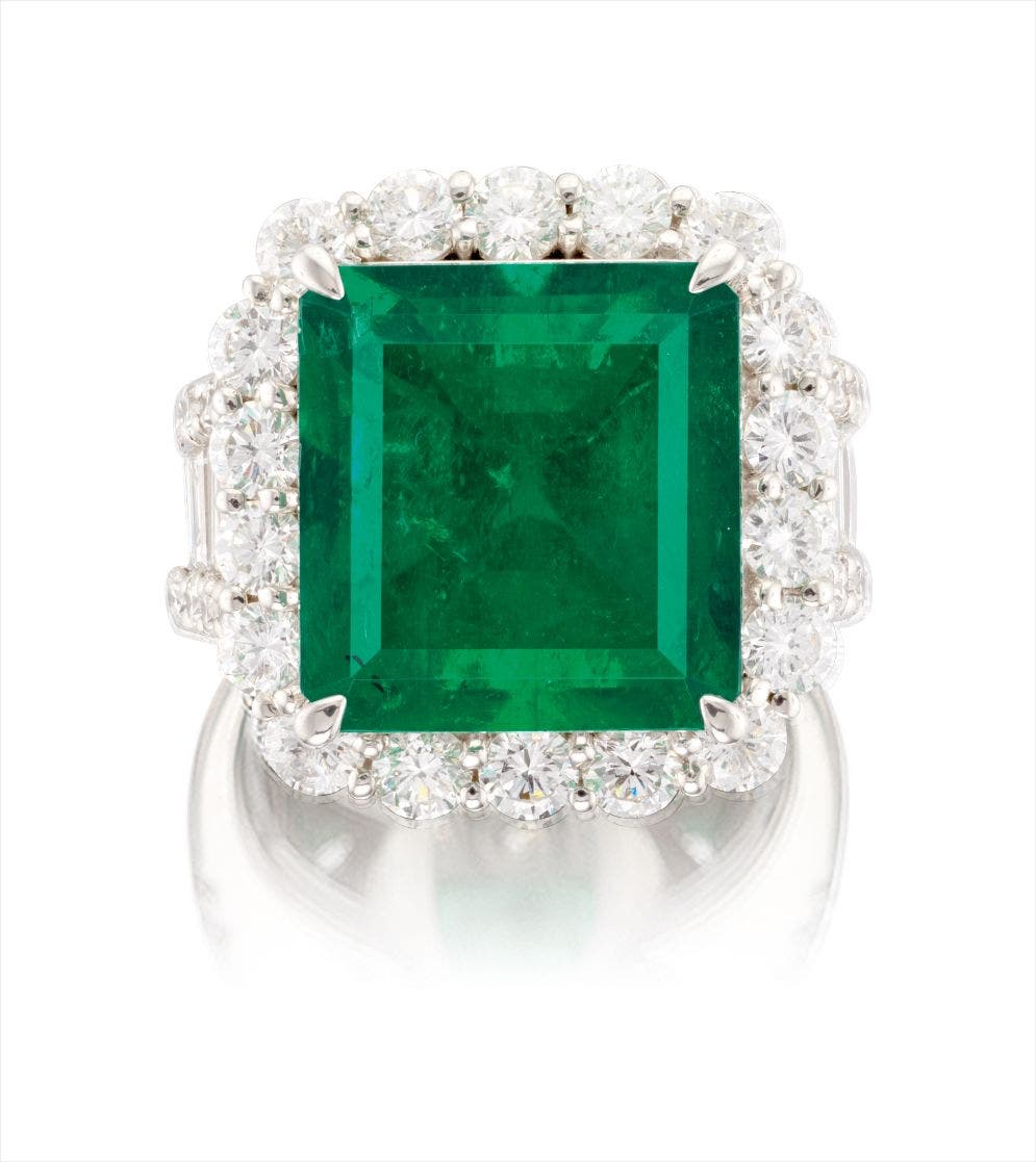 One step-cut emerald, 13.30 caratsDiamonds in the surround, totaling approximately 3.90 caratsPlatinum(13.30-carat Emerald)