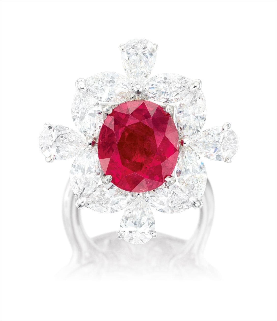 One oval ruby, 7.39 caratsPear- and marquise-shaped diamonds, totalling approximately 5.60 caratsPlatinum and 18 karat yellow gold(7.39-carat Ruby)