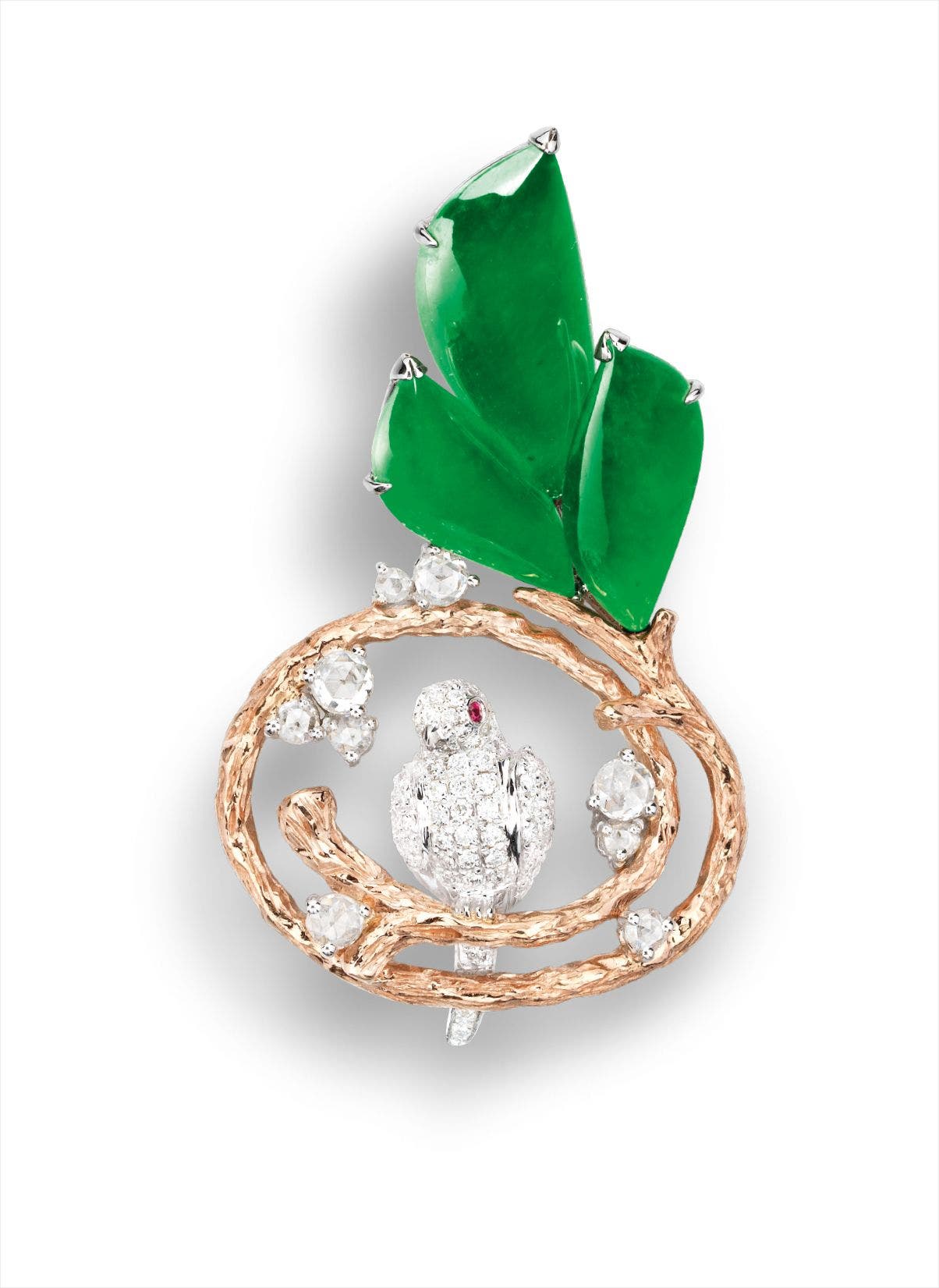 Three paisley-shaped jadeites, <em>measuring approximately 12.42 x 5.54 x 1.78mm to 15.47 x 6.96 x 3.68mm </em>Brilliant- and rose-cut diamonds set on bird, with ruby-set eyes18 karat pink and white gold<em>With a karat white gold chain, length approximately 400mm </em>(Jadeites) <em>Hong Kong Jade & Stone Laboratory report, numbered SJ146026, dated 8 February 2017, Type A jadeite, natural colour without any resin. </em>