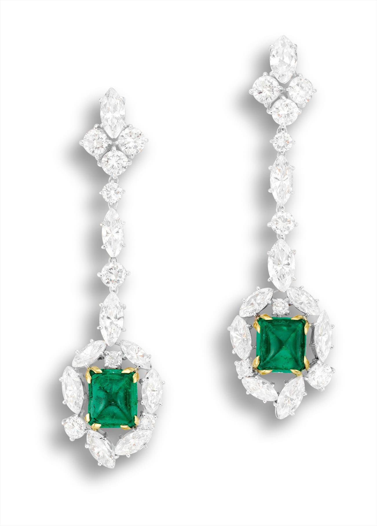 Two sugarloaf emeralds, 3.85 and 3.64 caratsMarquise-shaped and brilliant-cut diamonds, altogether weighing approximately 8.00 carats18 karat white and yellow gold(3.85- and 3.64-carat Emeralds) <em>Two AGL reports, numbered CS 1079511 and CS 1079512, both dated 3 November 2016, Colombia, with minor clarity enhancement, traditional type. </em>