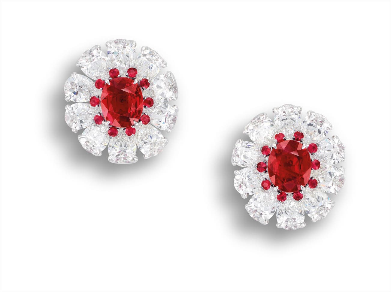 Two cushion-shaped rubies, 2.08 and 2.01 caratsTwenty pear-shaped diamonds in the surround, totalling 9.50 carats