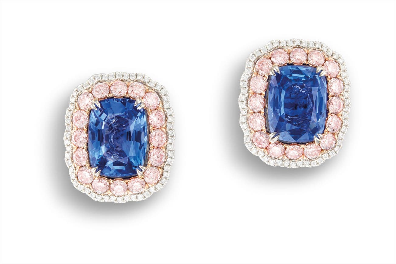 Two cushion-shaped sapphires, 5.94 and 5.74 caratsPink diamonds, totalling approximately 2.85 carats; and other diamonds in the surround18 karat white and pink gold(5.94- and 5.74-carat Sapphires) <em>Gübelin report, numbered 17031035/1 and 2, dated 20 March 2017, Sri Lanka, no indications of heating.</em>