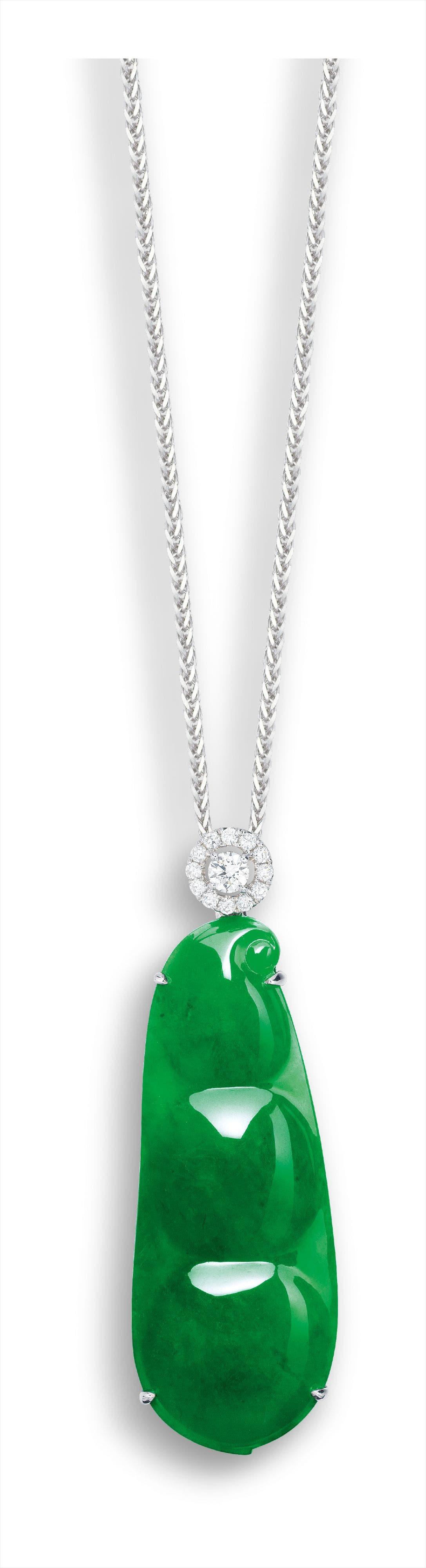 One jadeite peapod, <em>measuring approximately 46.50 x 17.83 x 6.51mm</em>Smaller diamonds on side, totalling approximately 1.40 carats18 karat white gold<em>With a 18 karat white gold link-chain, length approximately 450mmm</em>(Jadeite peapod) <em>Hong Kong Jade & Stone Laboratory report numbered KJ 95037, dated 16 March 2017, Type A jadeite, natural colour without any resin.</em>