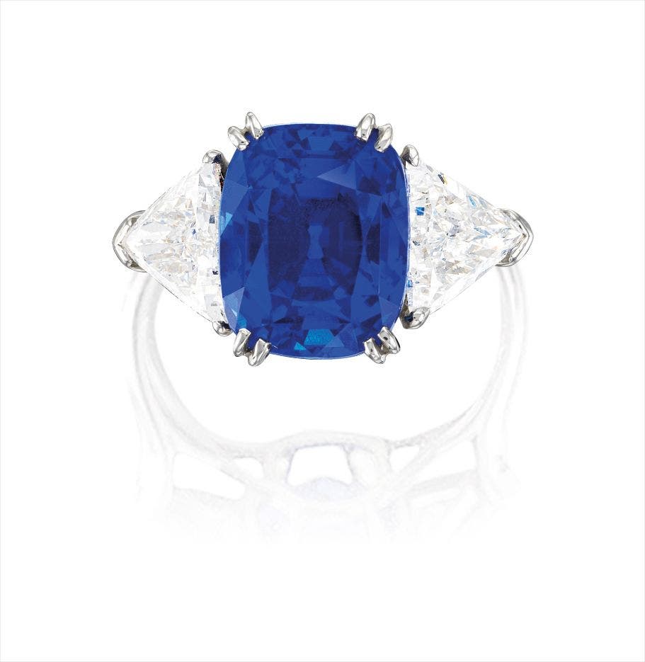 One cushion-shaped sapphire, 6.73 caratsTwo trilliant-cut diamonds on side, together approximately 1.20 caratsPlatinum(6.73-carat Sapphire) <em>GRS report, numbered GRS2016-028299, dated 22 February 2017, Sri Lanka, no indication of thermal treatment, GRS-type 'royal blue'.</em>
