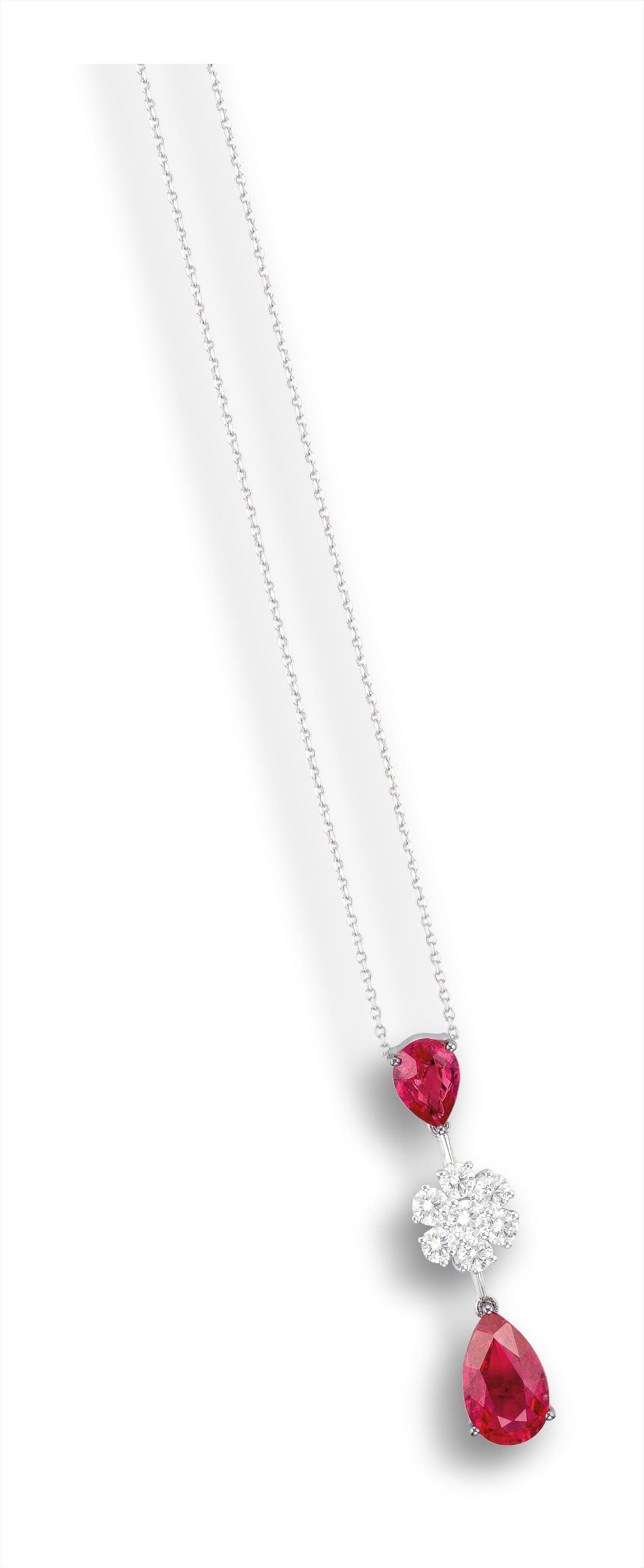 Two pear-shaped rubies, 2.29 and 1.02 caratsSeven brilliant-cut diamonds18 karat white gold<em>With a 18 karat white gold link-chain, length approximately 400mm</em>(2.29- and 1.02-carat Rubies) <em>GRS report, numbered GRS2011-062097, dated 29 June 2011, Burma, no indication of thermal treatment.</em>