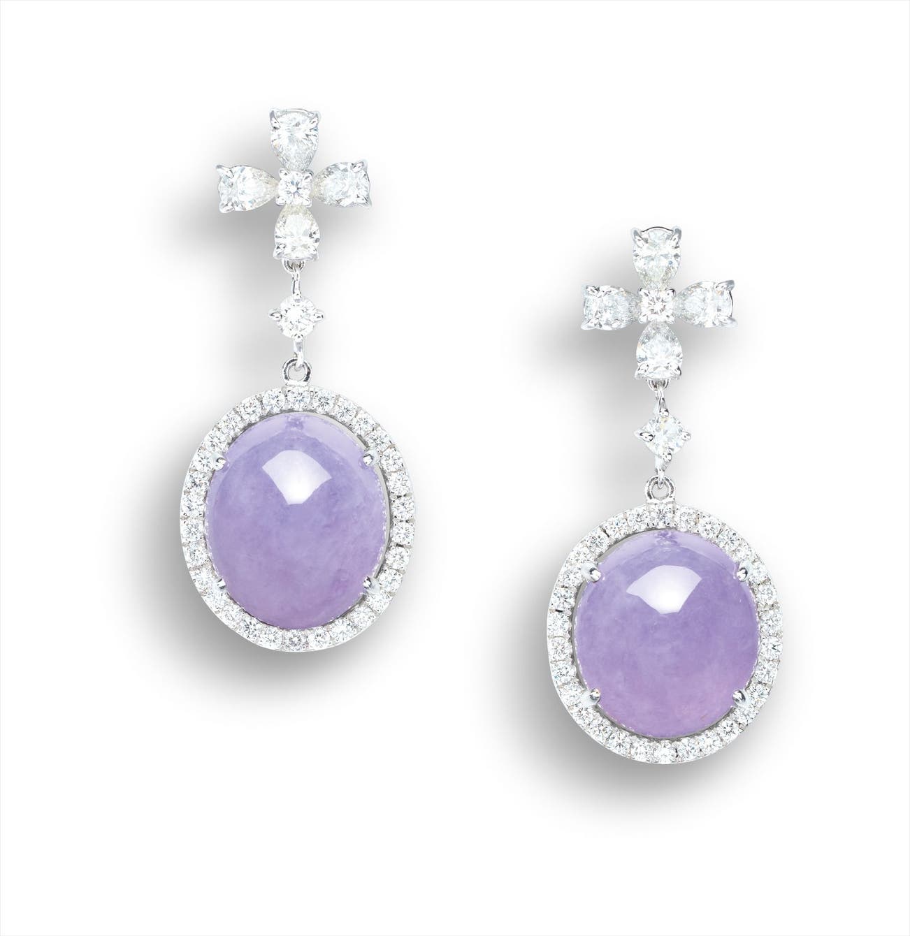 A Pair of Lavender Jadeite Cabochon and Diamond Pendent Earrings