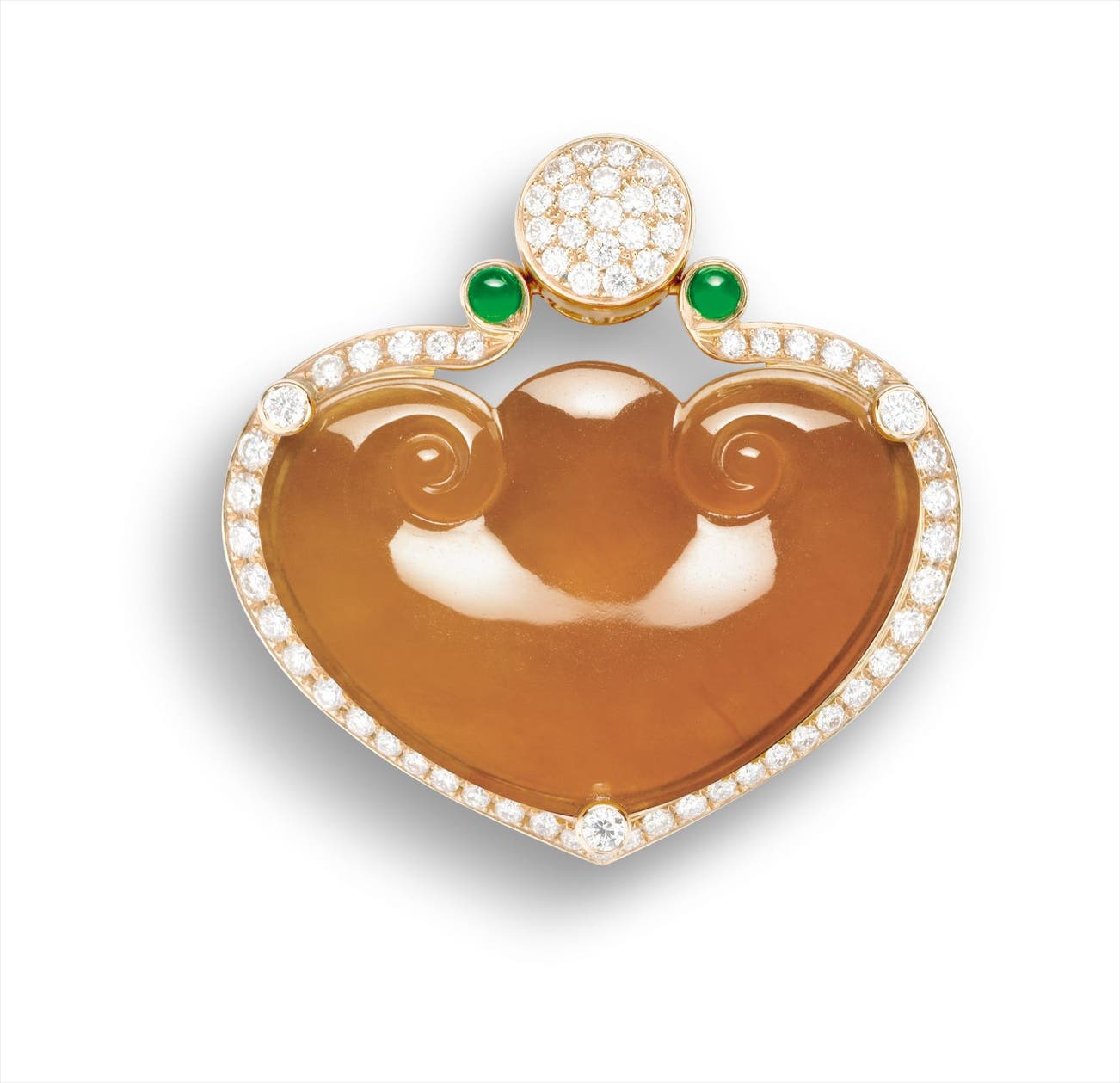 Red jadeite 'ruyi', <em>measuring approximately 30.23 x 20.80 x 4.20mm</em>Diamonds in the surround, totalling approximately 1.10 carats