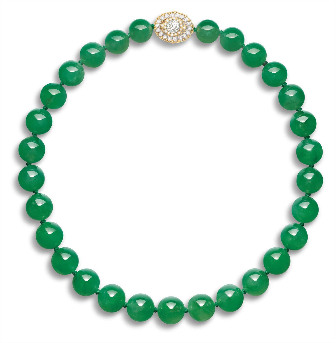 Twenty-nine jadeite beads, <em>measuring approximately 15.63 to 13.42mm</em>One round brilliant-cut diamond on clasp, approximately 1.00 carat18 karat yellow and white gold(Jadeite beads) <em>Hong Kong Jade & Stone Laboratory report numbered KJ 95171(1-3), dated 23 March 2017, Type A jadeite, natural colour without any resin.</em>