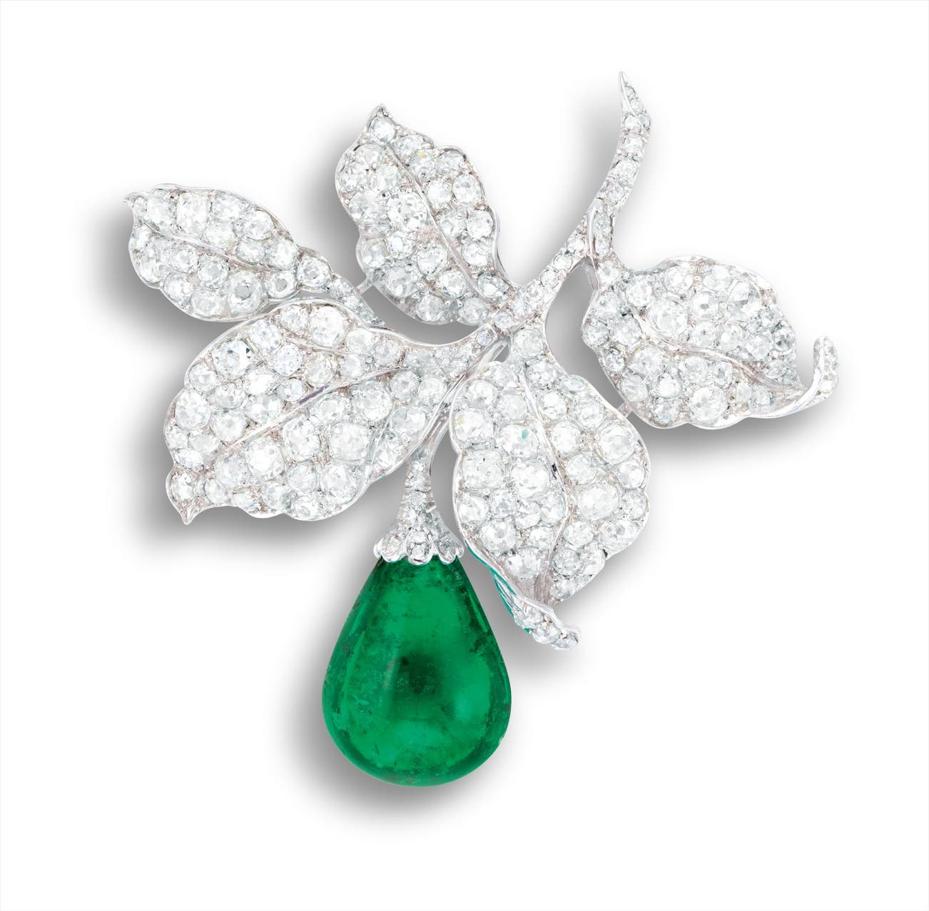 One emerald drop, 19.11 carats,<em> measuring approximately 10.99-14.98 x 21.65mm</em>Old-cut diamonds on leaves, totalling approximately 15.00 caratsPlatinum<em>With a fitted box</em>(19.11-carat Emerald) <em>SSEF report, dated 17 Nov 2016, Colombia, indications of clarity modification, minor amount of oil in fissures at the time of testing.</em>
