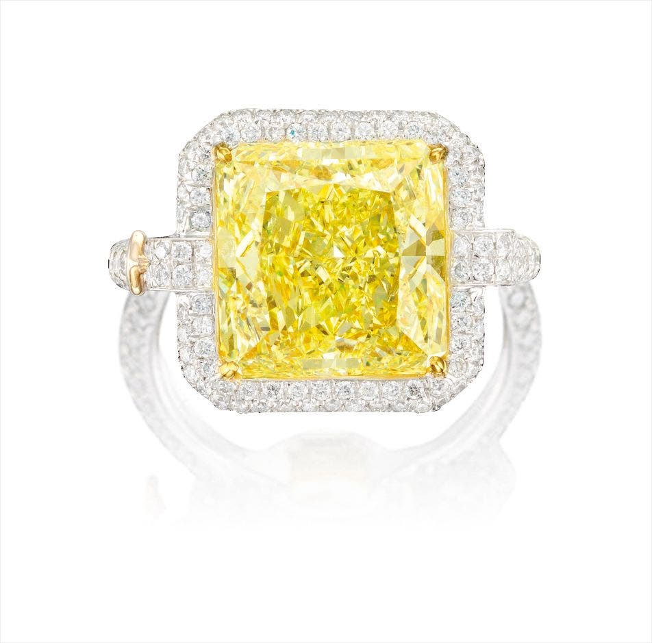 One cut-cornered rectangular modified brilliant-cut Fancy Intense Yellow diamond, 6.86 caratsDiamonds in the galley and shoulders, totalling approximately 1.35 carats