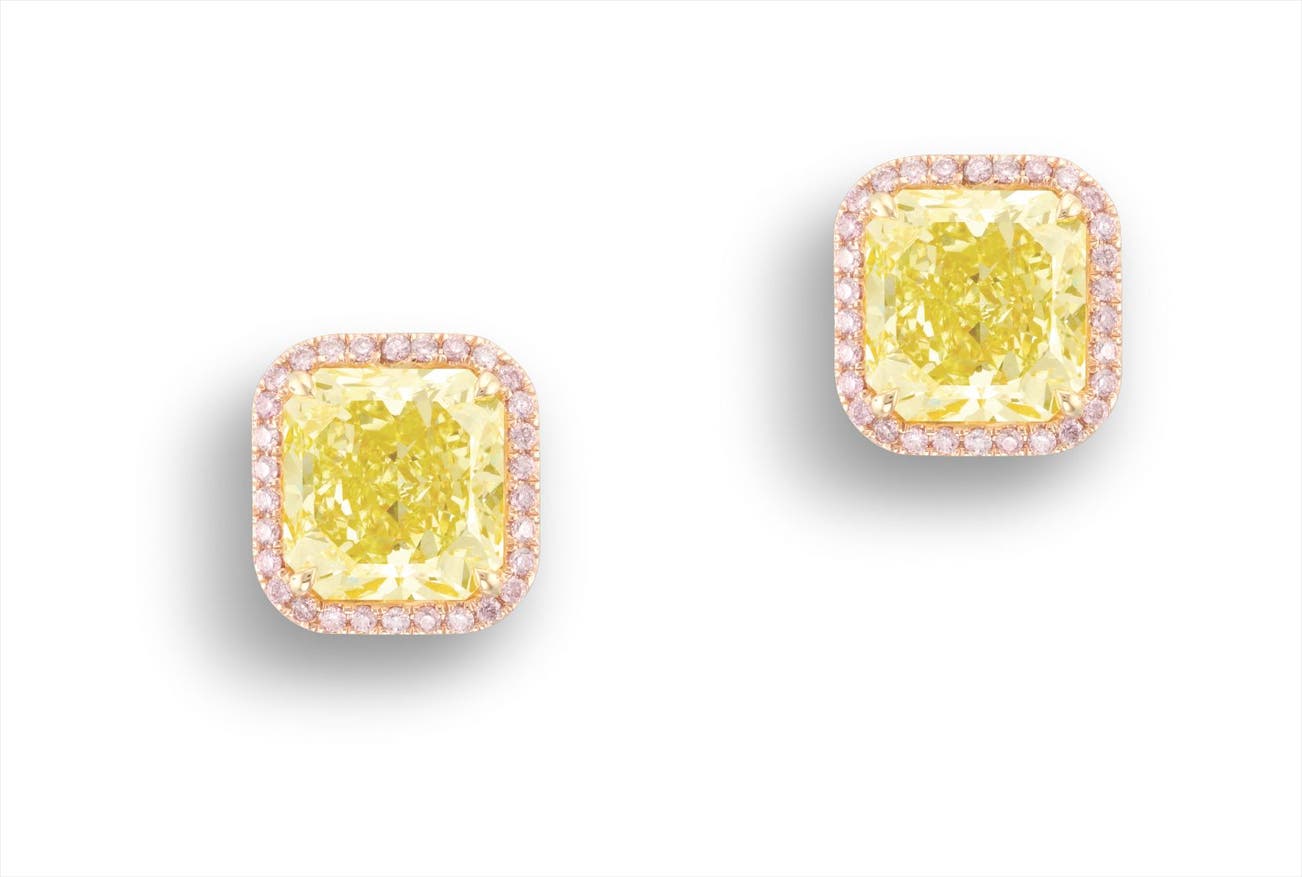 Two cut-cornered rectangular modified brilliant-cut Fancy Yellow diamonds, 4.08 and 4.01 caratsPink diamonds to the surround18 karat pink, white and yellow gold(4.08-carat Diamond) <em>GIA report, numbered 1182108372, 12 January 2017, Fancy Yellow colour, Internally Flawless.</em>