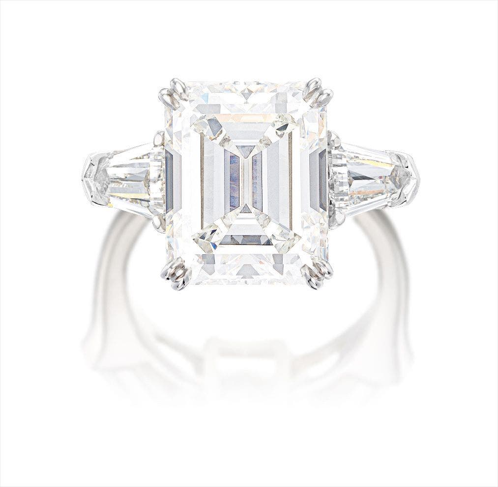 One emerald-cut diamond, 9.01 caratsTwo shield-shaped diamonds on side, together weighing approximately 1.60 caratsPlatinum(9.01-carat Diamond) <em>GIA report, numbered 2175349927, dated 21 January 2016, F colour, VVS2 clarity.</em>