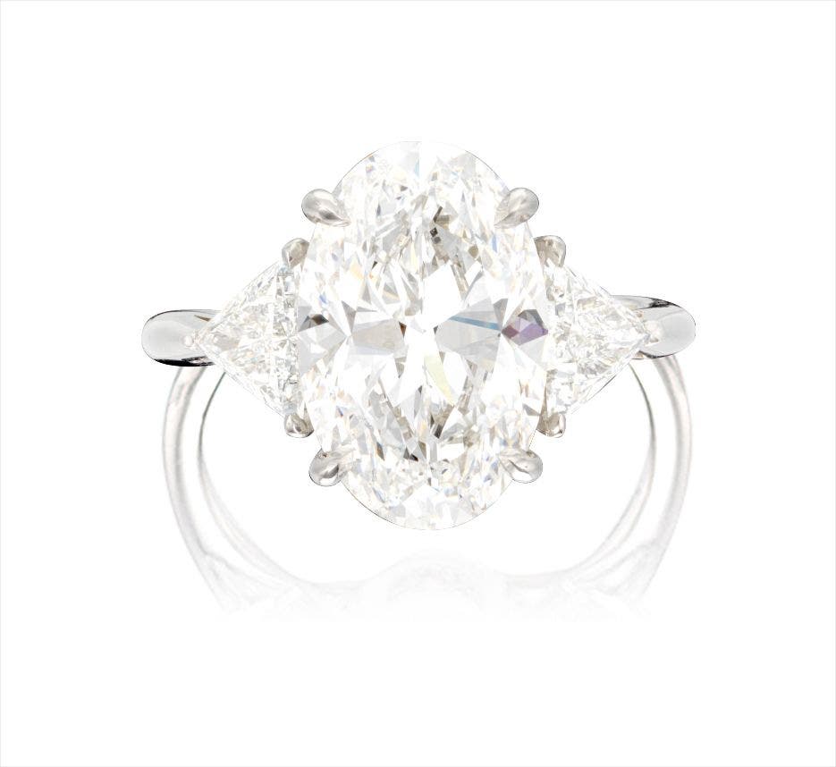 One oval diamond, 5.08 caratsTwo trilliant-cut diamonds on the sidePlatinum(5.08-carat Diamond) <em>GIA report, numbered 2185128358, dated 25 Januaray 2017, D colour, Internally Flawless, with Excellent Polish and Symmetry.</em>