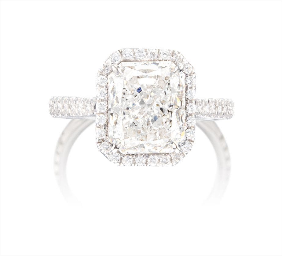 One cut-cornered rectangular modified brilliant-cut diamond, 3.01 caratsTiny round diamonds in the surroundPlatinum(3.01-carat Diamond)<em> GIA report, numbered 6167796165, dated 17 November 2014, D colour, VS2 clarity.</em>
