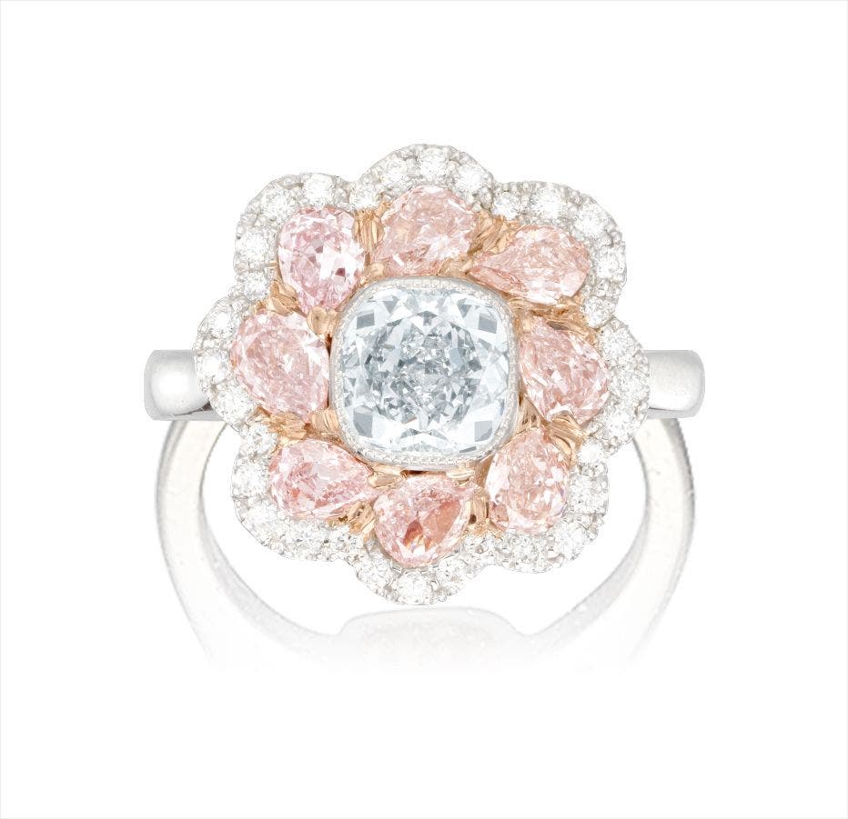 One cushion modified brilliant-cut Very Light Blue diamond, 1.05 caratsEight pear-shaped pink diamonds in the surround, totalling approximately 1.05 carats