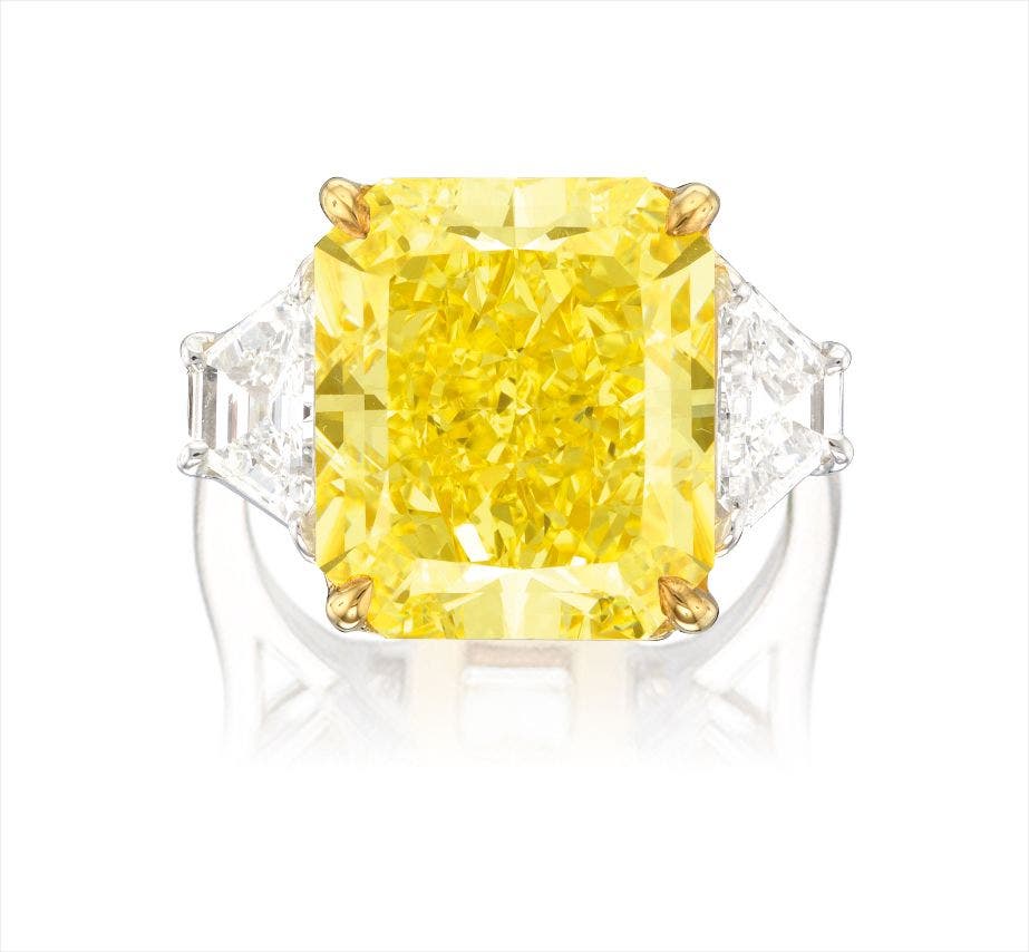 One cut-cornered rectangular modified brilliant-cut Fancy Intense Yellow diamond, 11.12 caratsTwo trapezoid diamonds, totalling approximately 1.30 caratsPlatinum and 18 karat yellow gold(11.12-carat Diamond)<em> GIA report, numbered 2171292648, dated 29 February 2016, Fancy Intense Yellow colour, Internally Flawless.</em>
