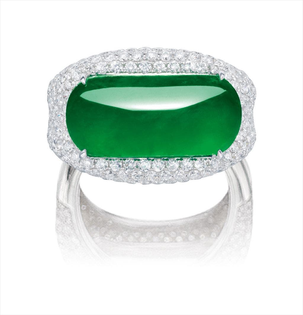 One jadeite saddle-top, <em>measuring approximately 19.10 x 8.90 x 5.50mm</em>Pavé-set diamonds, totalling approximately 2.45 carats18 karat white gold(Jadeite saddle-top) <em>Hong Kong Jade & Stone Laboratory report numbered KJ 95186, dated 24 March 2017, Type A jadeite, natural colour without any resin.</em>