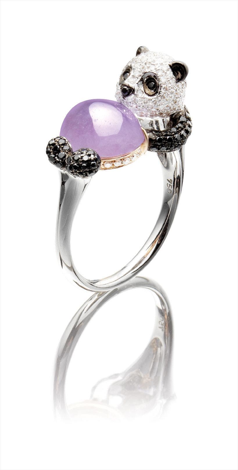 A Lavender Jadeite Cabochon, Black Diamond and Diamond 'Panda' Ring
