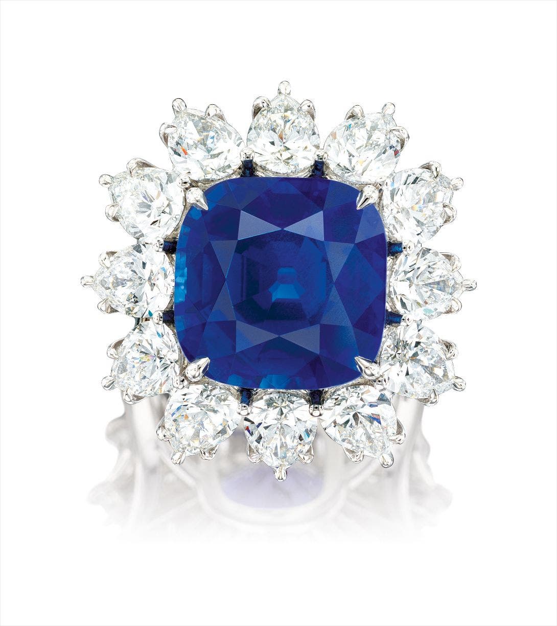 One cushion-shaped sapphire, 15.81 caratsTwelve pear-shaped diamonds, together weighing approximately 5.00 caratsPlatinum(15.81-carat Sapphire)