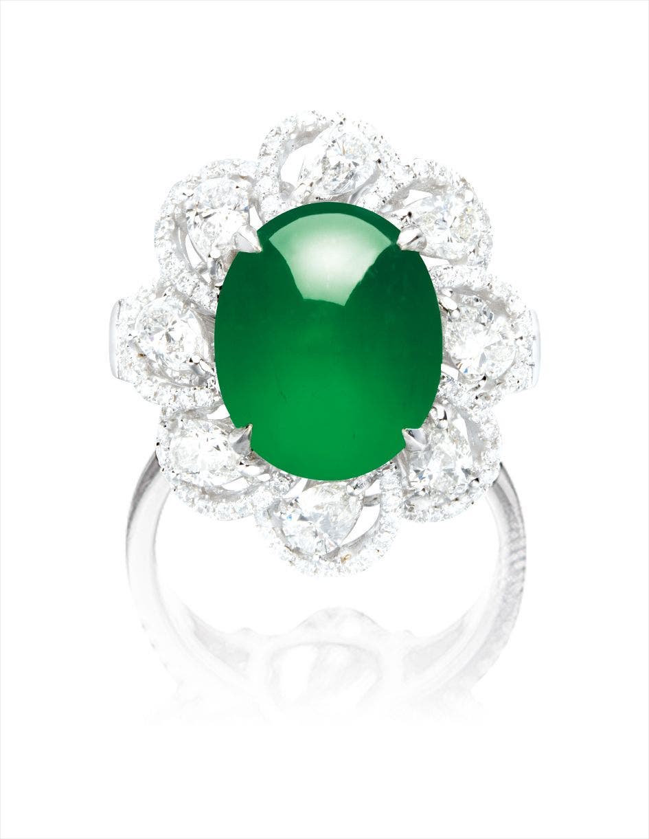 One jadeite cabochon, <em>measuring approximately 12.81 x 10.48 x 5.09mm</em>Brilliant-cut and pear-shaped diamonds in the surround, totalling approximately 1.75 carats18 karat white gold(Jadeite cabochon) <em>Hong Kong Jade & Stone Laboratory report numbered KJ 95266, dated 5 April 2017, Type A jadeite, natural colour without any resin.</em>