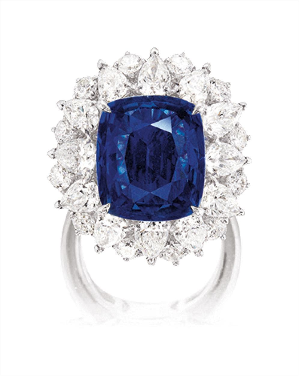 One cushion-shaped sapphire, 8.67 caratsPear- and brilliant-cut diamonds together approximately 3.00 carats18 karat white gold(8.67-carat Sapphire)