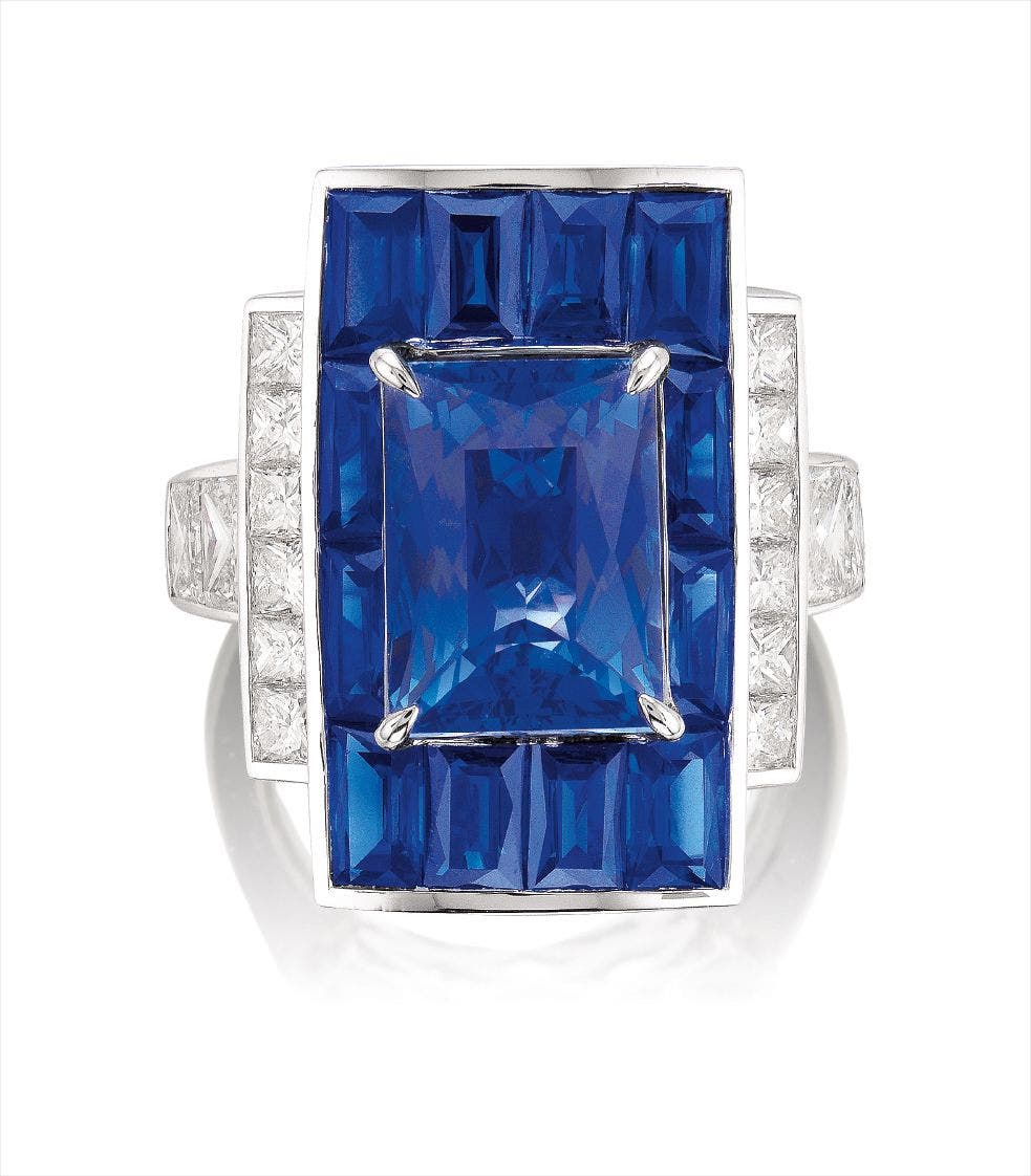 One rectangular-cut sapphire, 7.13 caratsTwelve rectangular-cut sapphires in the surround totaling approximately 4.15 carats