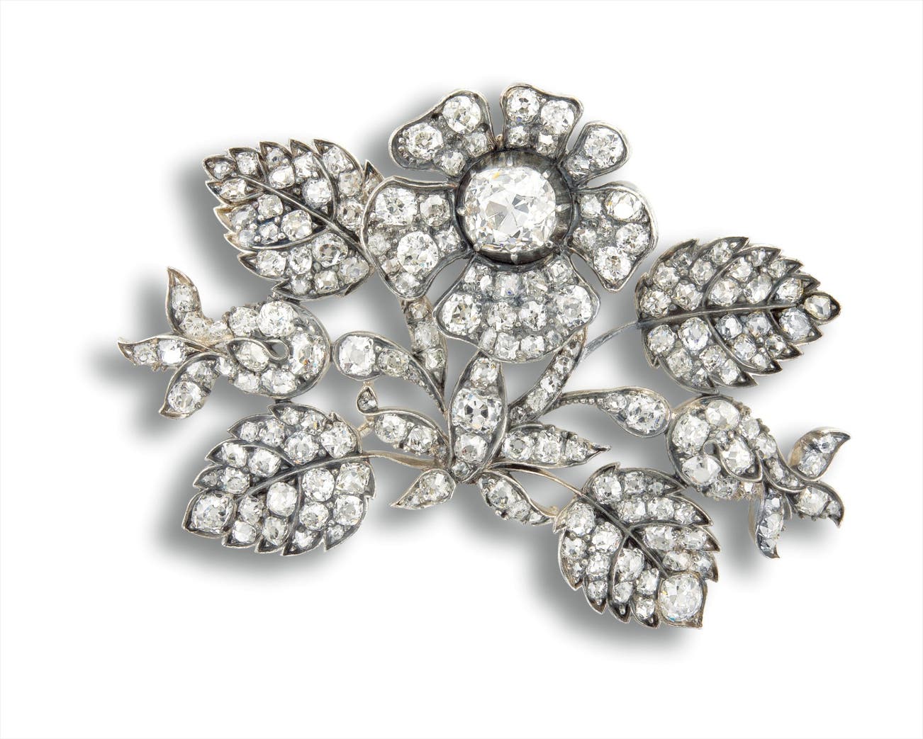 One old cushion-cut diamond, approximately 1.30 caratsOther old-cut diamonds totaling approximately 6.00 caratsSilver-topped 18 karat yellow gold<em>Pin fitting later added</em>