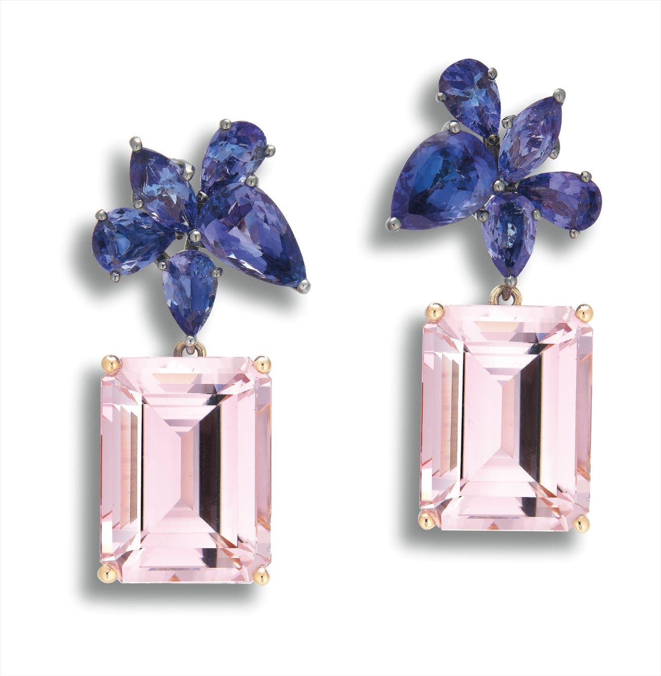 Two step-cut kunzites, together approximately 51.90 caratsEach set with five tanzanites in the surmount, together approximately 11.70 carats18 karat pink and blackened gold<em>Ear-pendants detachable </em>