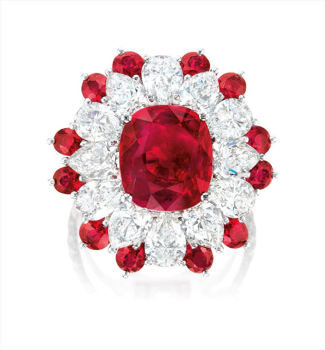 One cushion-shaped ruby, 5.19 caratsTwelve pear-shaped diamonds in the surround and brilliant-cut diamonds on shank, totalling approximately 5.40 caratsEmbellished by twelve rubies, together approximately 2.55 caratsPlatinum(5.19-carat Ruby)