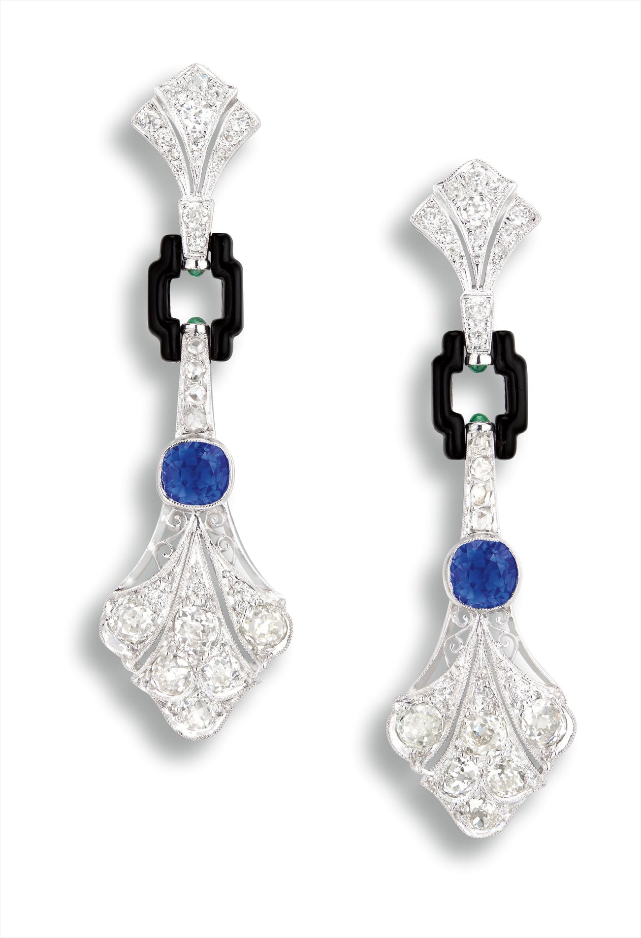 Two cushion-shaped sapphires, 1.53 and 1.31 caratsTops and pendants set with brilliant-cut diamonds, totalling approximately 3.00 caratsOnyx links, highlighted with cabochon emeraldsPlatinum<em>Please note that both gem reports feature the two sapphires in their previous jabot pin design.</em>(1.53 & 1.31-carat Sapphires)