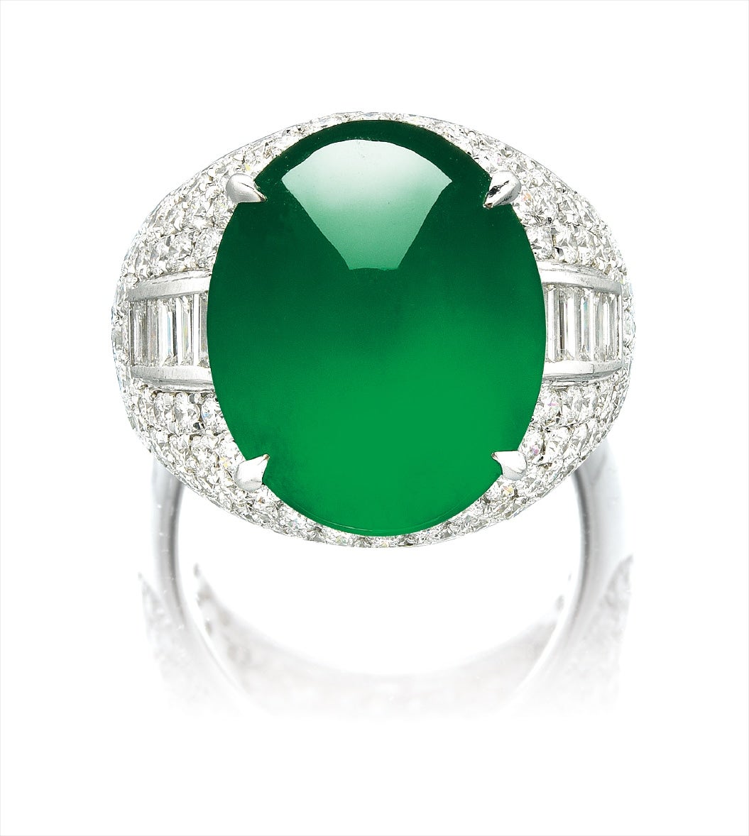 One oval jadeite cabochon, <em>measuring approximately 18.66 x 15.16 x 5.37mm</em>Brilliant-cut and baguette diamonds in the surround, totalling approximately 3.15 carats18 karat white gold(Jadeite Cabochon)