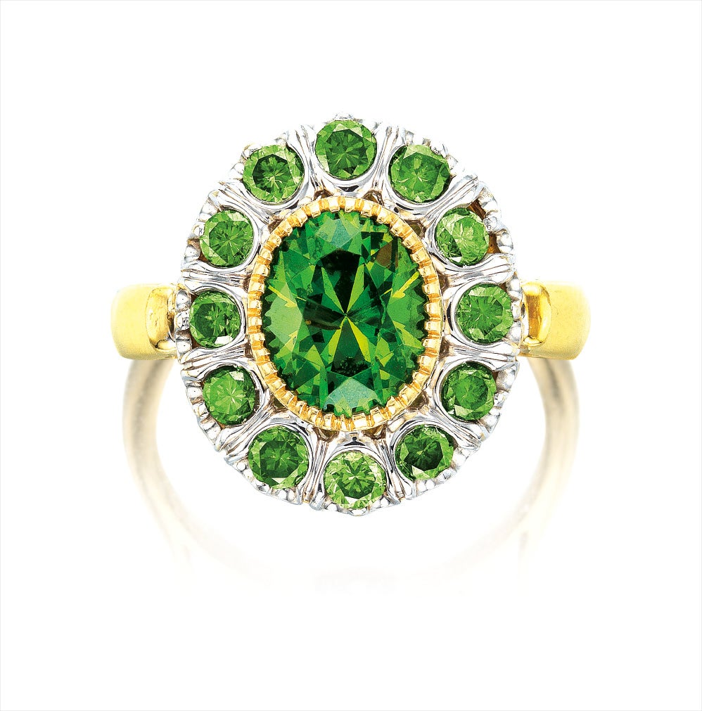One oval demantoid garnet, approximately 2.00 caratsSurrounded by twelve round demantoid garnets18 karat yellow gold(Demantoid Garnet in the centre)