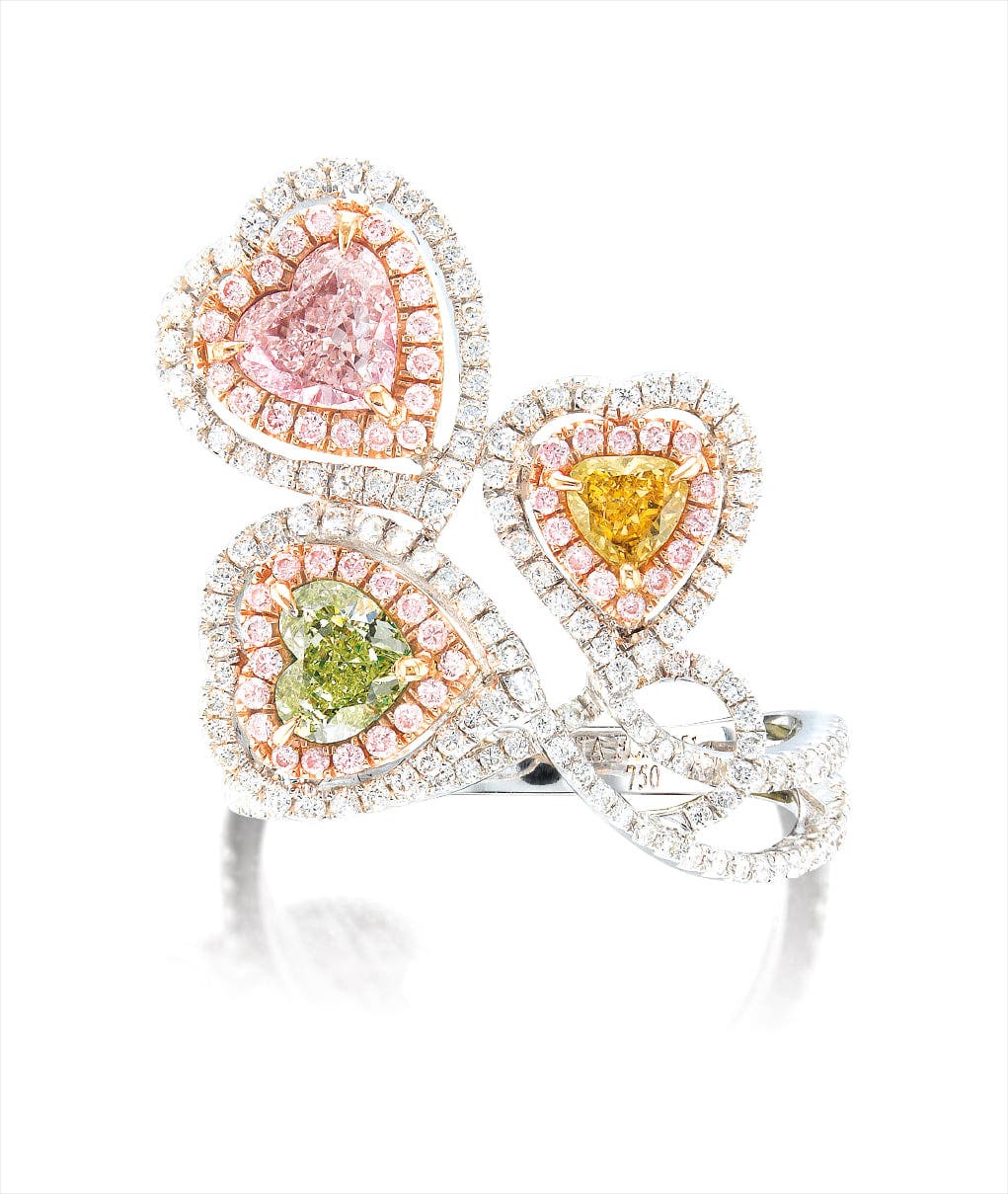 One heart-shaped Fancy Light Pink diamond, 0.51 caratOne heart-shaped diamond in green colour, 0.45 carat