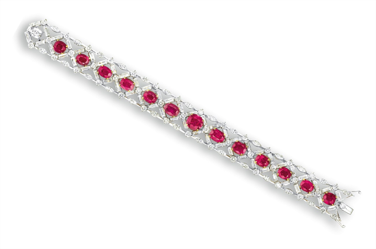 Thirteen rubies, together 17.05 caratsEmbellished with marquise, baguette and brilliant-cut diamonds, totalling approximately 12.85 carats18 karat white and yellow gold(Thirteen Rubies)