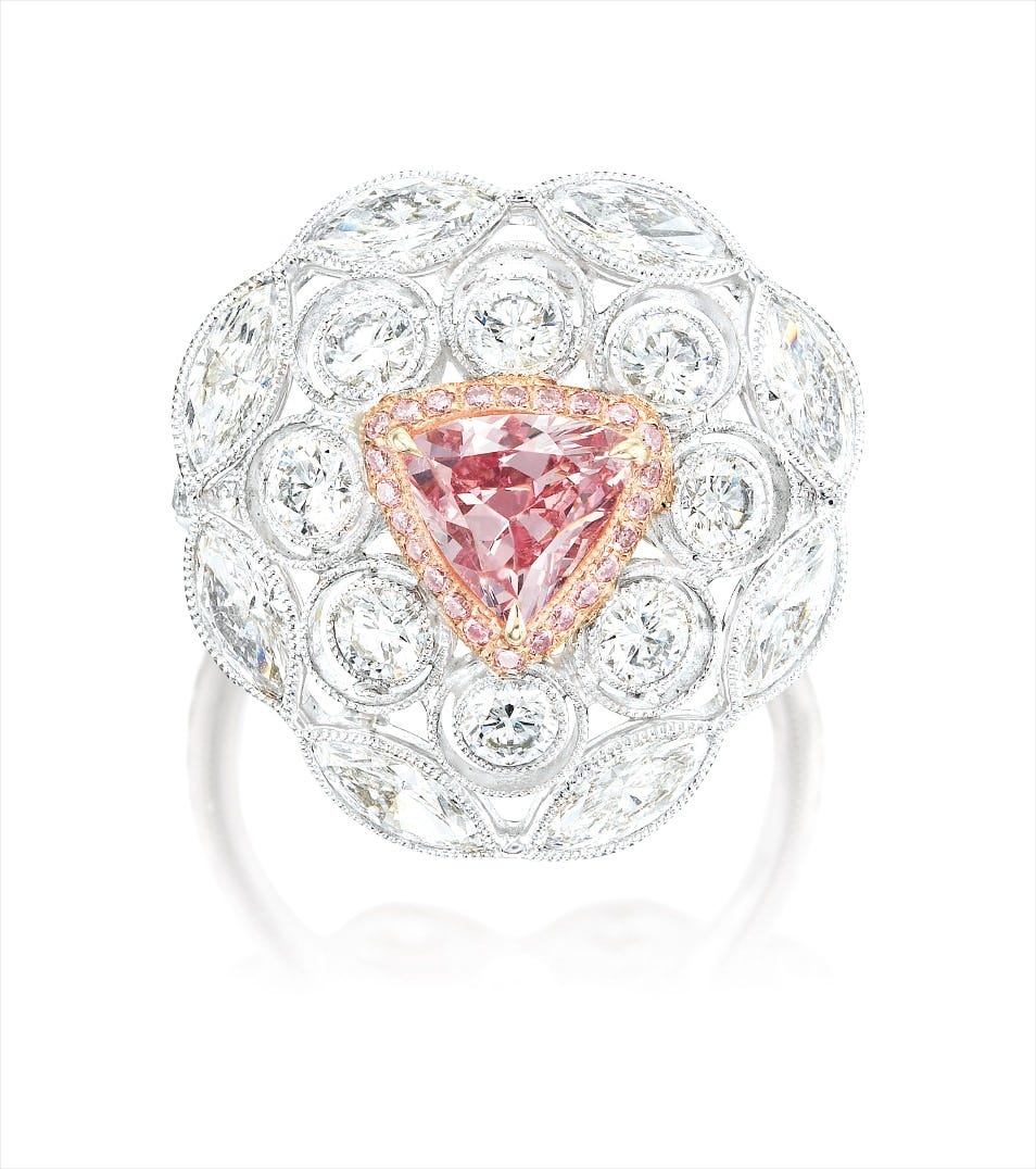 One triangular-cut Fancy Intense Pink diamond, 1.01 caratsSmaller pink diamonds, marquise-shaped and brilliant-cut diamonds in the surround, together approximately 2.50 carats18 karat white and pink gold(1.01-carat Pink Diamond)