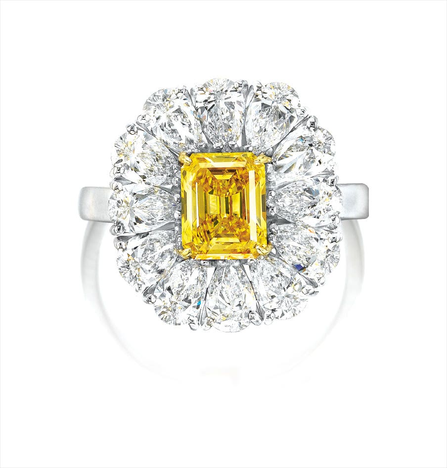 One cut-cornered rectangular step-cut Fancy Vivid Orangy Yellow diamond, 1.01 caratsSurrounded by twelve pear-shaped diamonds, totalling 2.50 caratsPlatinum and 18 karat yellow gold(1.01-carat Yellow Diamond)