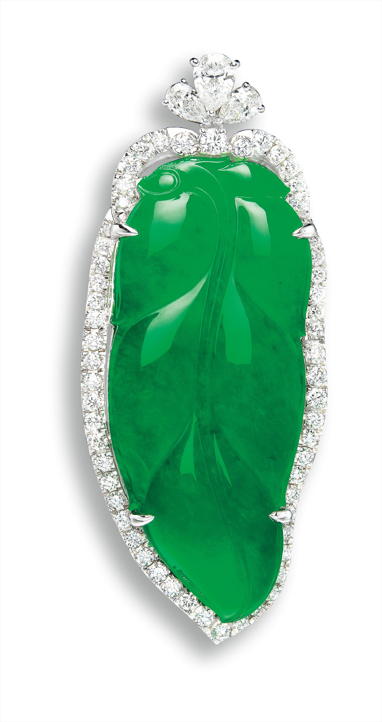 Since ancient times, the symbolism of plants and flowers was always glorified by the Chinese. As a celebratory joy for marriage or weddings, leaf is a pun for numerous offsprings and children, make it a very popular motif amongst artisans in jadeite carving. The vivid green hue of this carved jadeite 'leaf' pendant signifies a joyful and spirited vitality, the source of youth and aspiration.